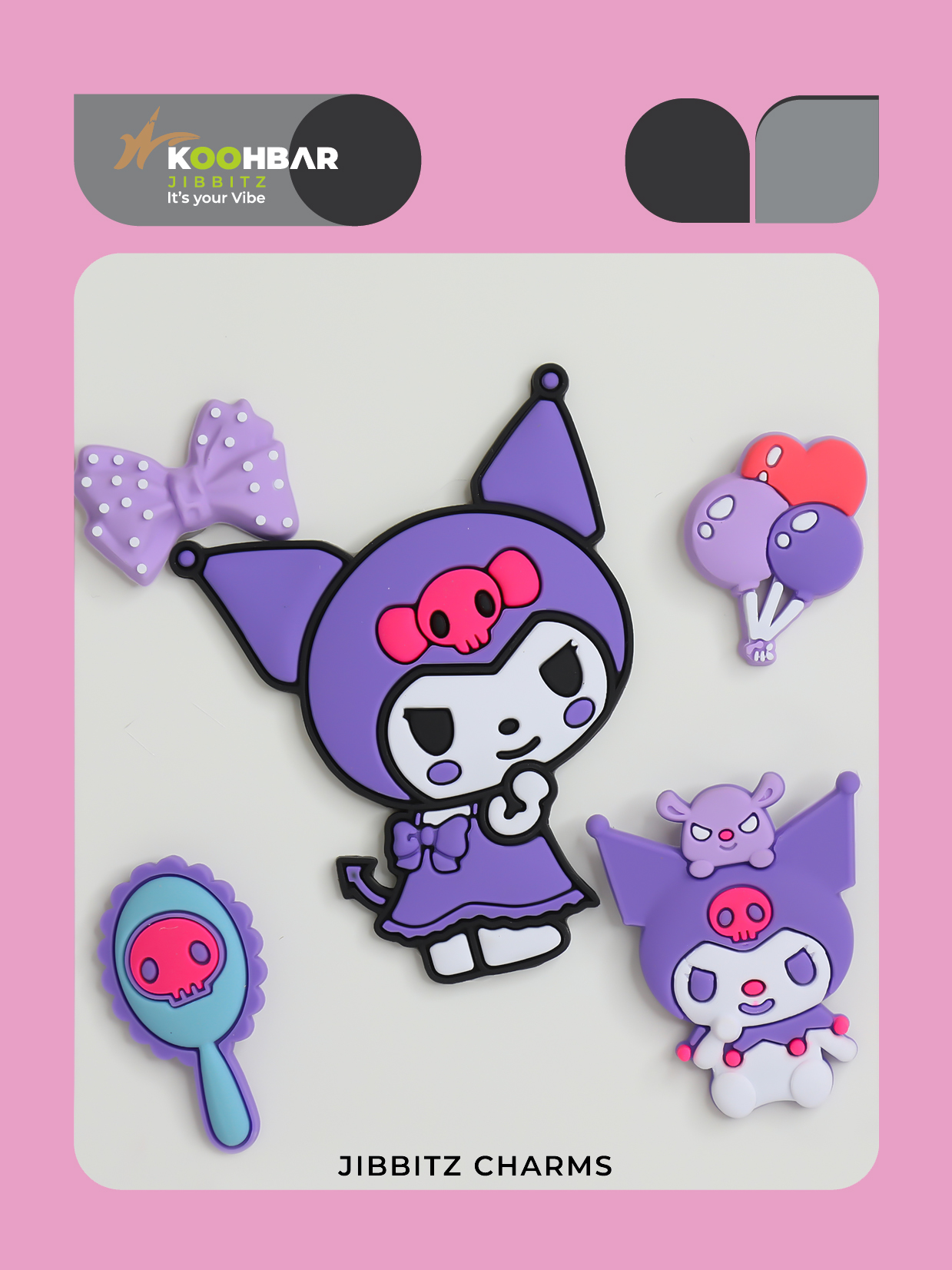 پک کامل جیبیتز طرح کرومی بنفش شامل5 عدد جیبیتزفانتزی برای تزئین کفش کراکس، کیف یا کولهپشتی. ساخته شده از مواد نرم و مقاوم. انتخابی جذاب برای علاقمندان به استایل فانتزی. محصولی از برند کوهبر.