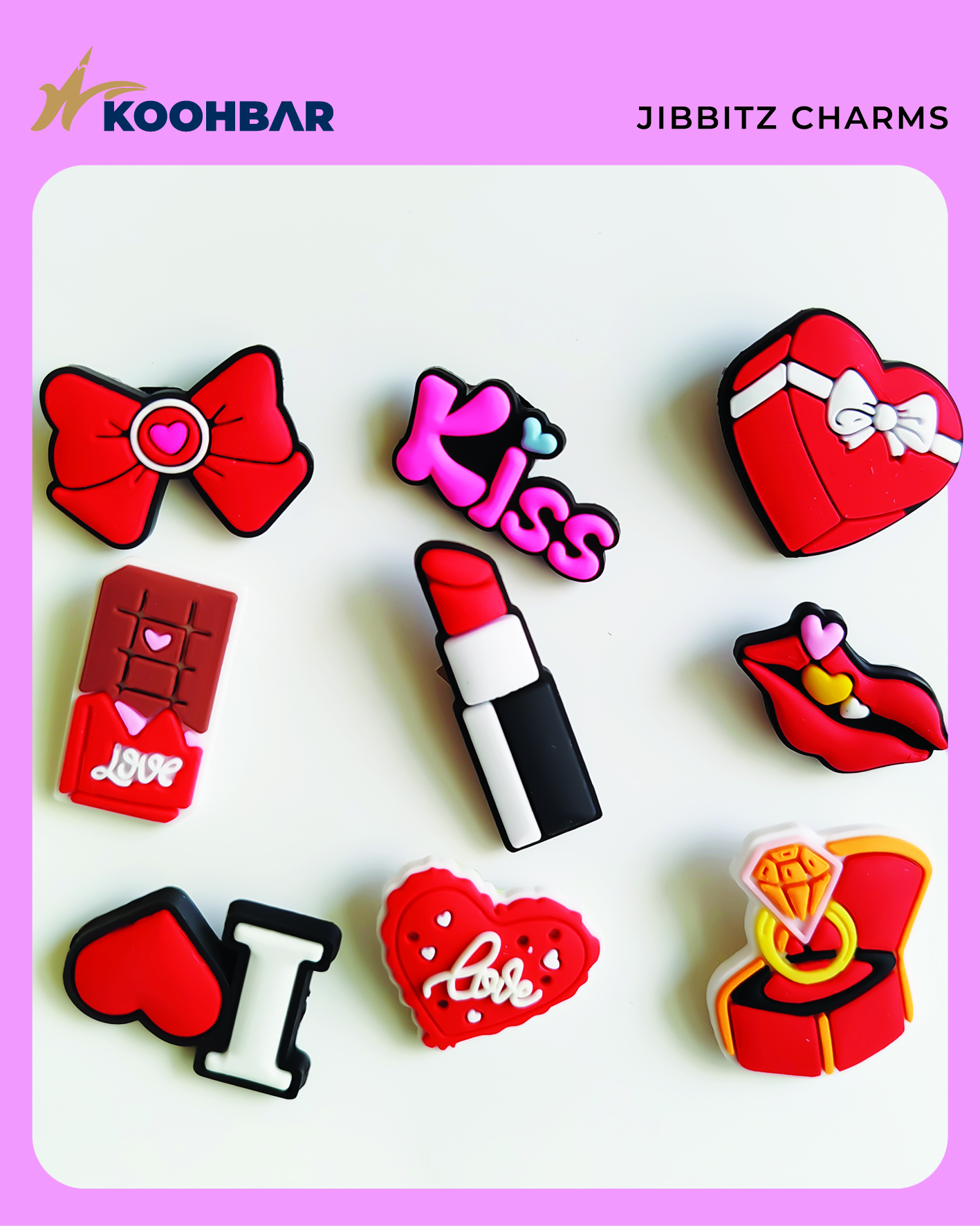 پک کامل جیبیتز طرح لاو شامل 9 عدد جیبیتزفانتزی برای تزئین کفش کراکس، کیف یا کولهپشتی. ساخته شده از مواد نرم و مقاوم. انتخابی جذاب برای علاقمندان به استایل فانتزی. محصولی از برند کوهبر.
