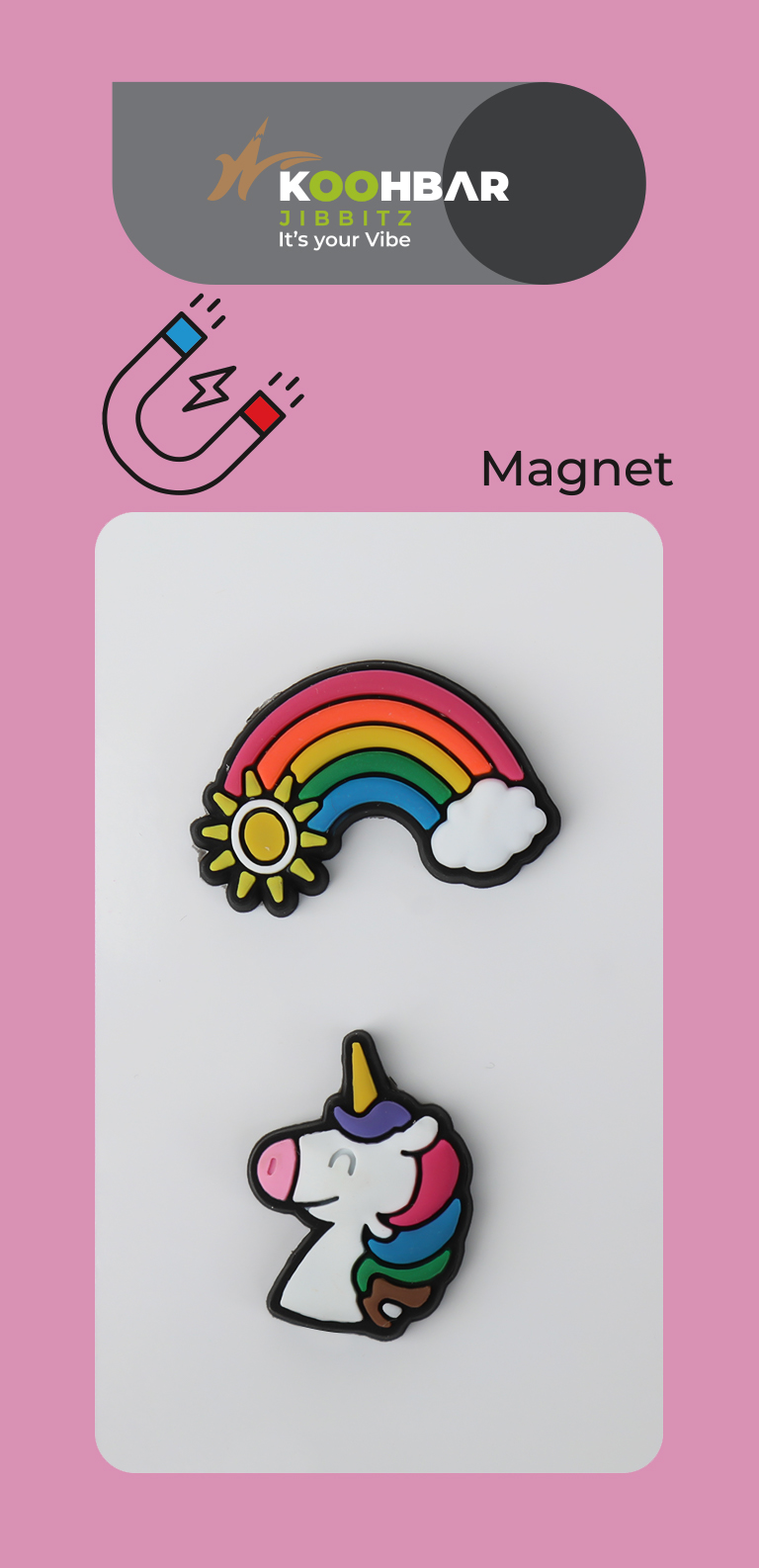 پک دو عددی جیبیتز مگنتی سیلیکونی با طرح رنگینکمان و یونیکورن؛ مناسب برای تزیین سطوح فلزی. انتخابی شاد، فانتزی و باکیفیت از برند کوهبر.